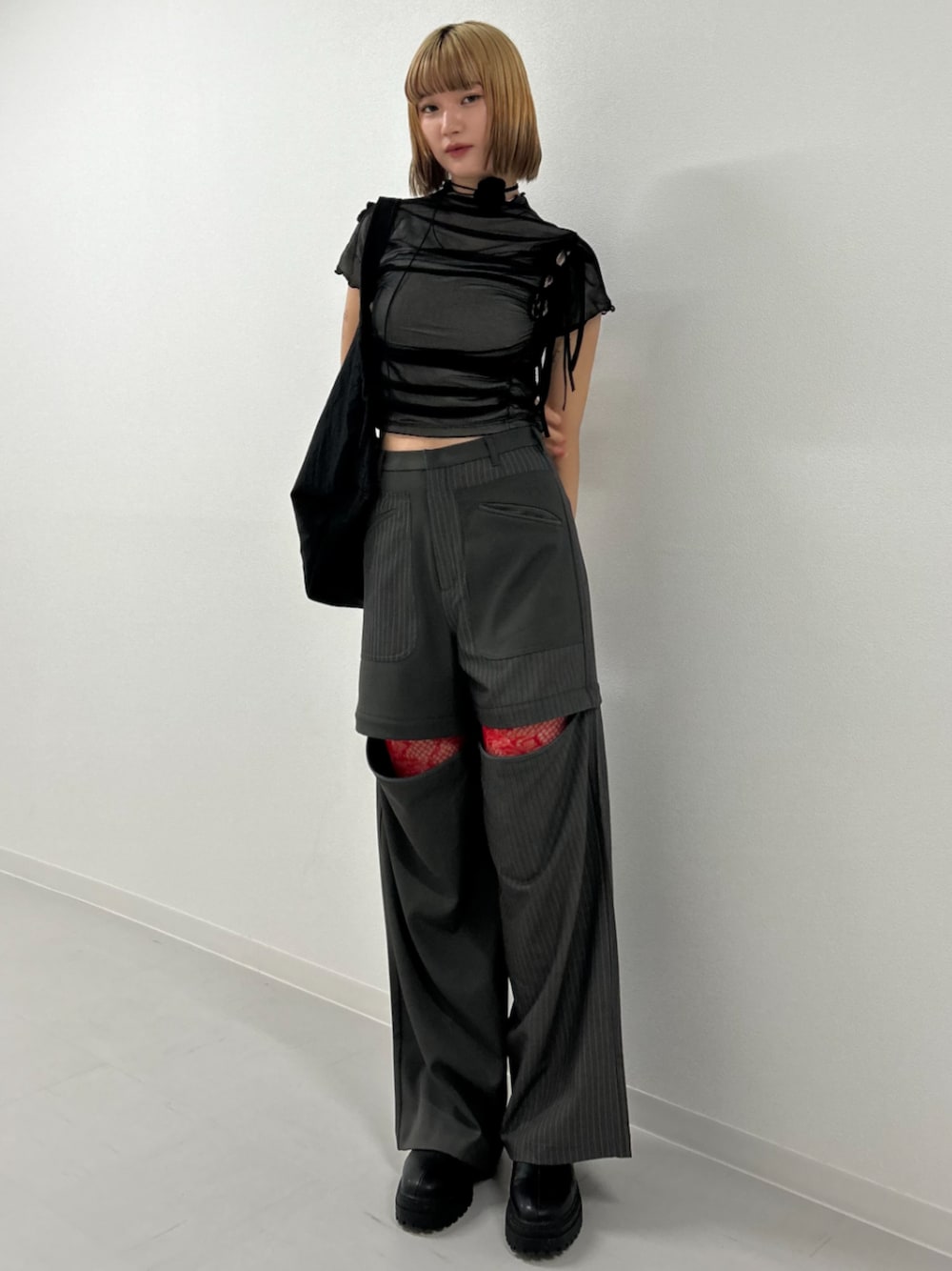 レイヤードした赤のレースタイツがポイント🍒