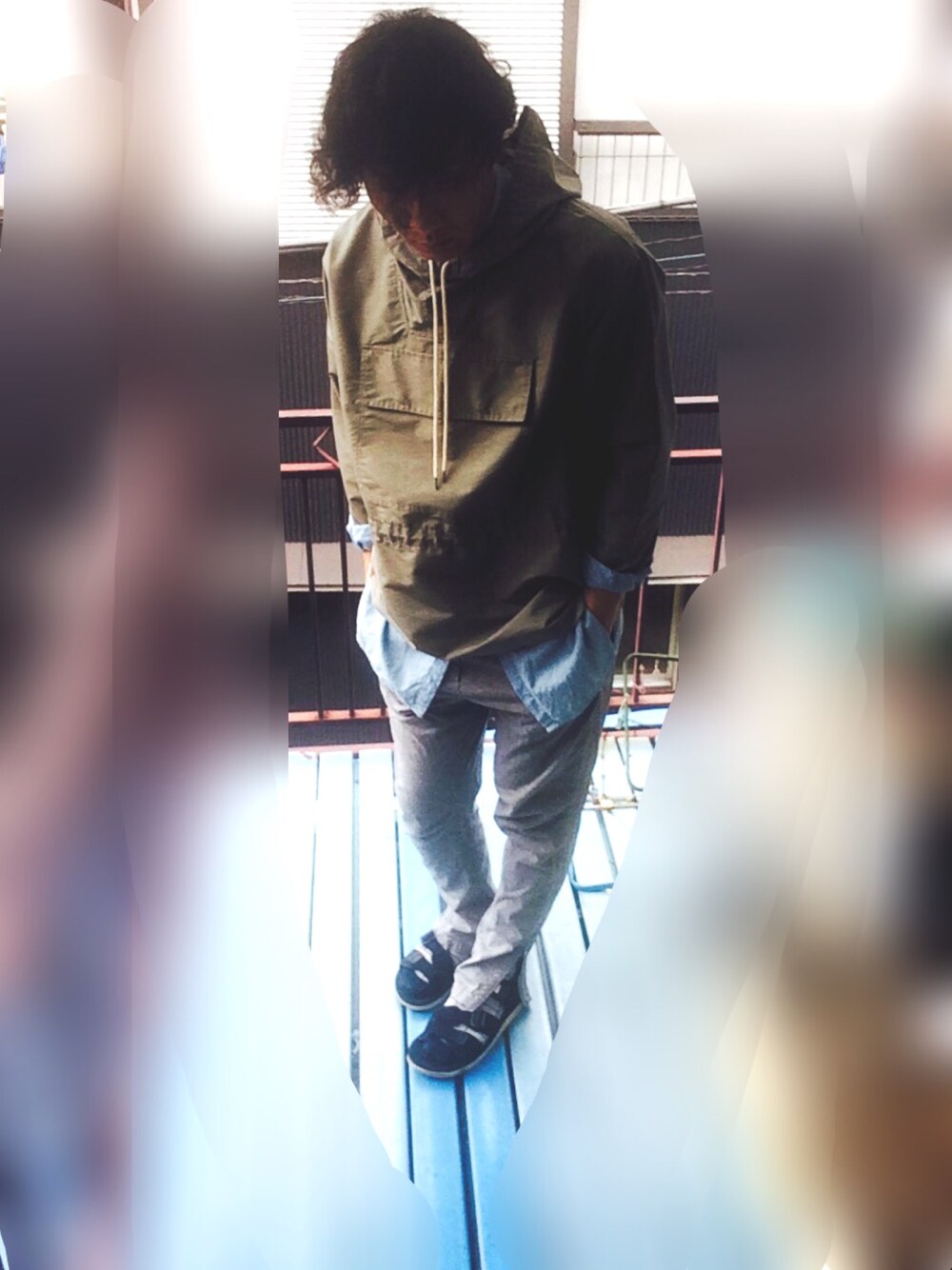 淡いトーンでまとめてみました。 雨降りそーなのでアノラックパーカーです。