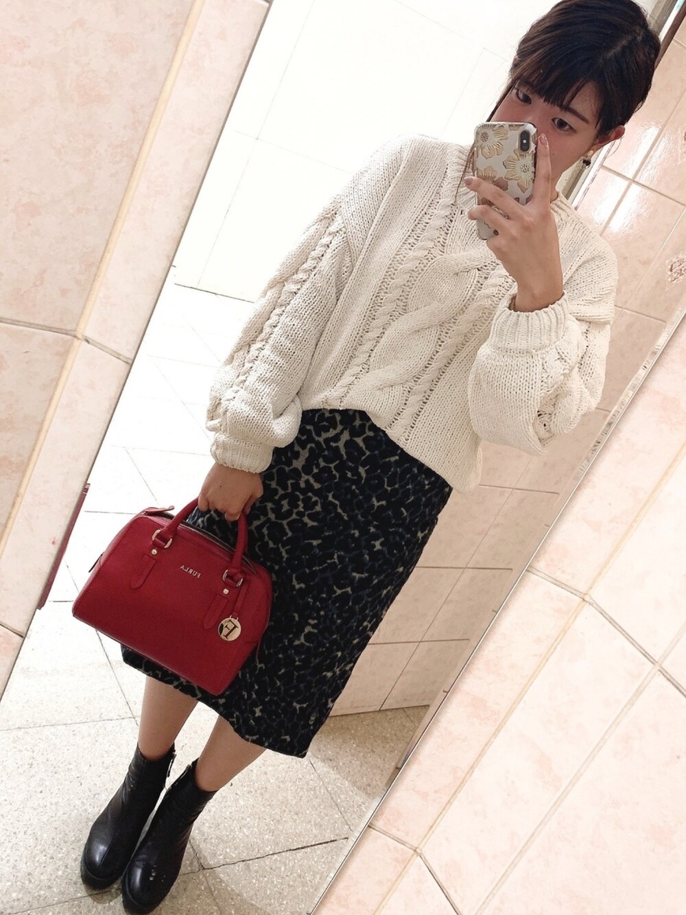 秋冬らしい色合いで タイトスカートはレオパ柄だけど 色味によって強く見えない感じ好きです 今年のブーツデビュー👢 赤のカバンでアクセント♡