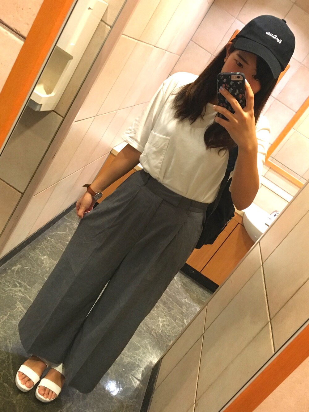 グレーのズボンほんと楽チン ついにキャップ買ってしまい かぶってしまった… 白か黒かで迷ったけど黒にした!