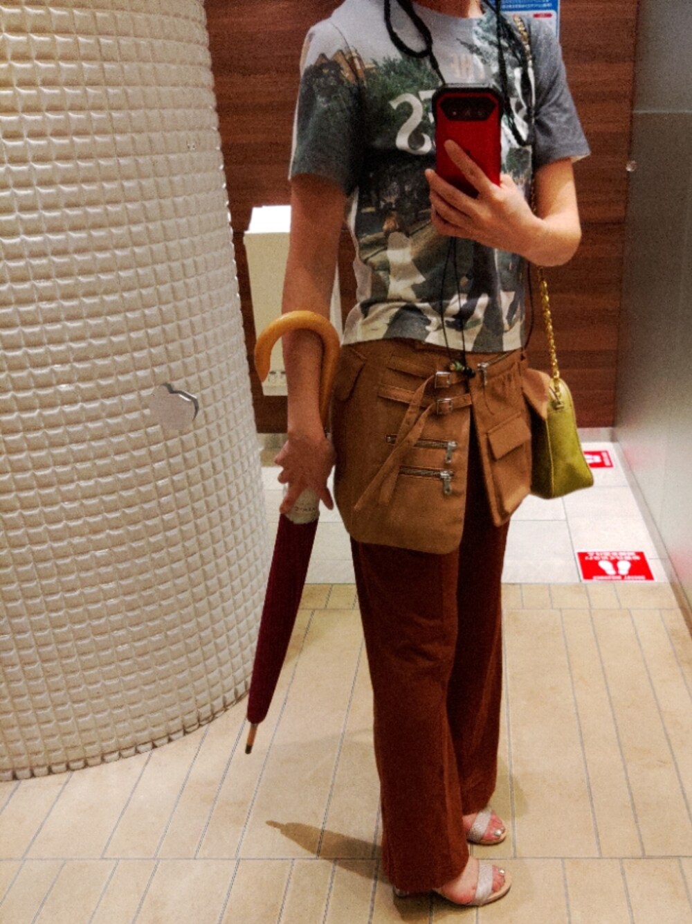 台風が去ってまだ暑い日。半袖でサンダルだけど茶色基調で。エプロンつけたかったのもあり。パンツはユニクロとmameのコラボの。楽。