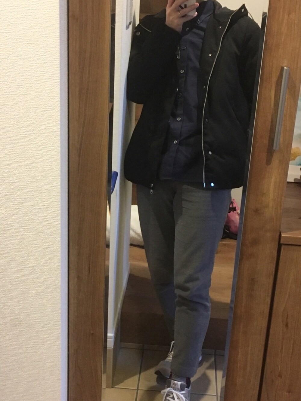 ボトム、スニーカーがグレーで淡い感じなのでトップスはネイビー、ブラックで引き締めました✨ こういうときに明るい色のマフラーとかあったらいいなぁと最近は赤かオレンジの触り心地のいいのないかなぁと探しています^_^;