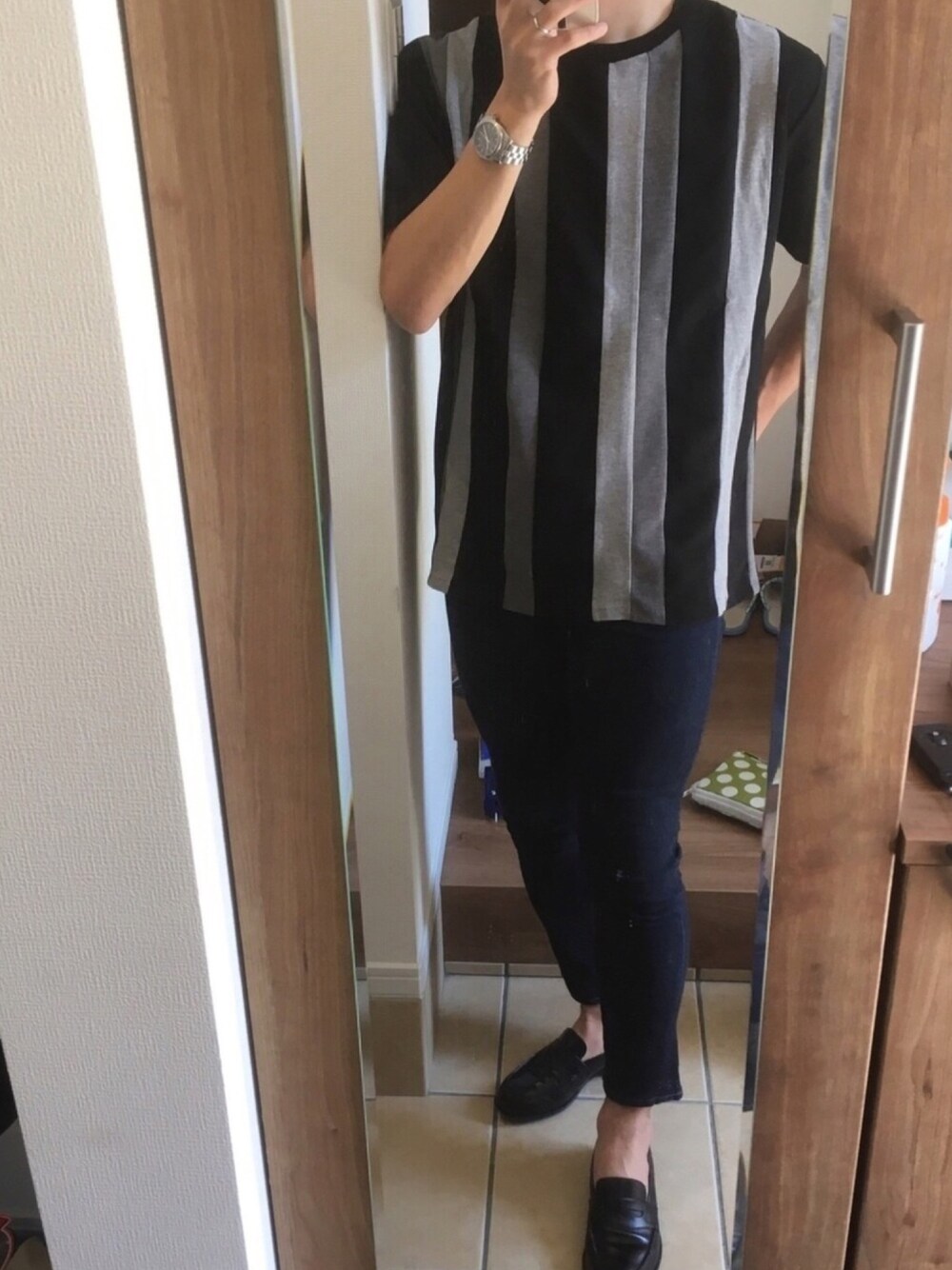 Tシャツのストライプが映えるように他はシンプルにまとめてます✨ カジュアルすぎないように足元はローファーで🎵