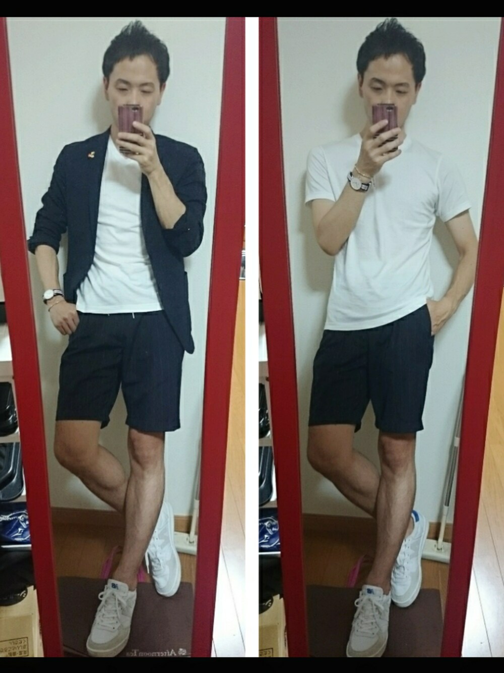 昨日の夜の雨で今日のサッカーが中止になりなんだかなぁって感じです。。せっかくの天然芝での試合だったのに。。 さてコーデですが、昨日に続き今日もいまいちな天気で気温も高くないので、ジャケットコーデです🎵 ゴールドのチェリーのブローチをポイントに着けてみました💡 それに合わせてブレスレットもゴールド、時計もゴールドとゴールド合わせです(・ω・)ノ パンツはタック入りのストライプショートパンツをロールアップ✨肌の面積を少しでも多くして短い脚をカバーですw 足下はスニーカーでカジュアルに🍀