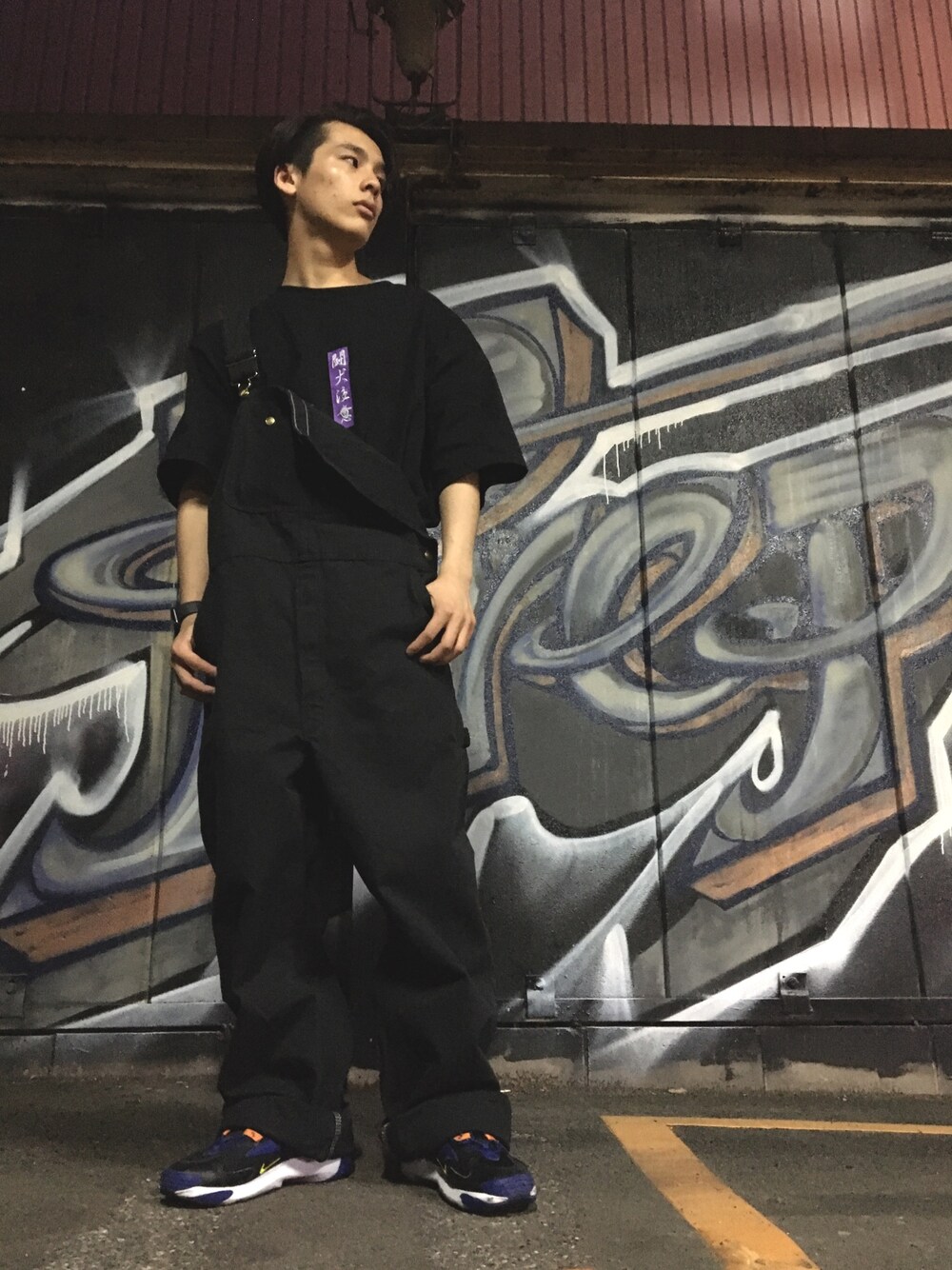 ブラック系のTシャツ/カットソー、ブラック系のつなぎ/オールインワンを着用したメンズの春コーディネートの1枚目の写真