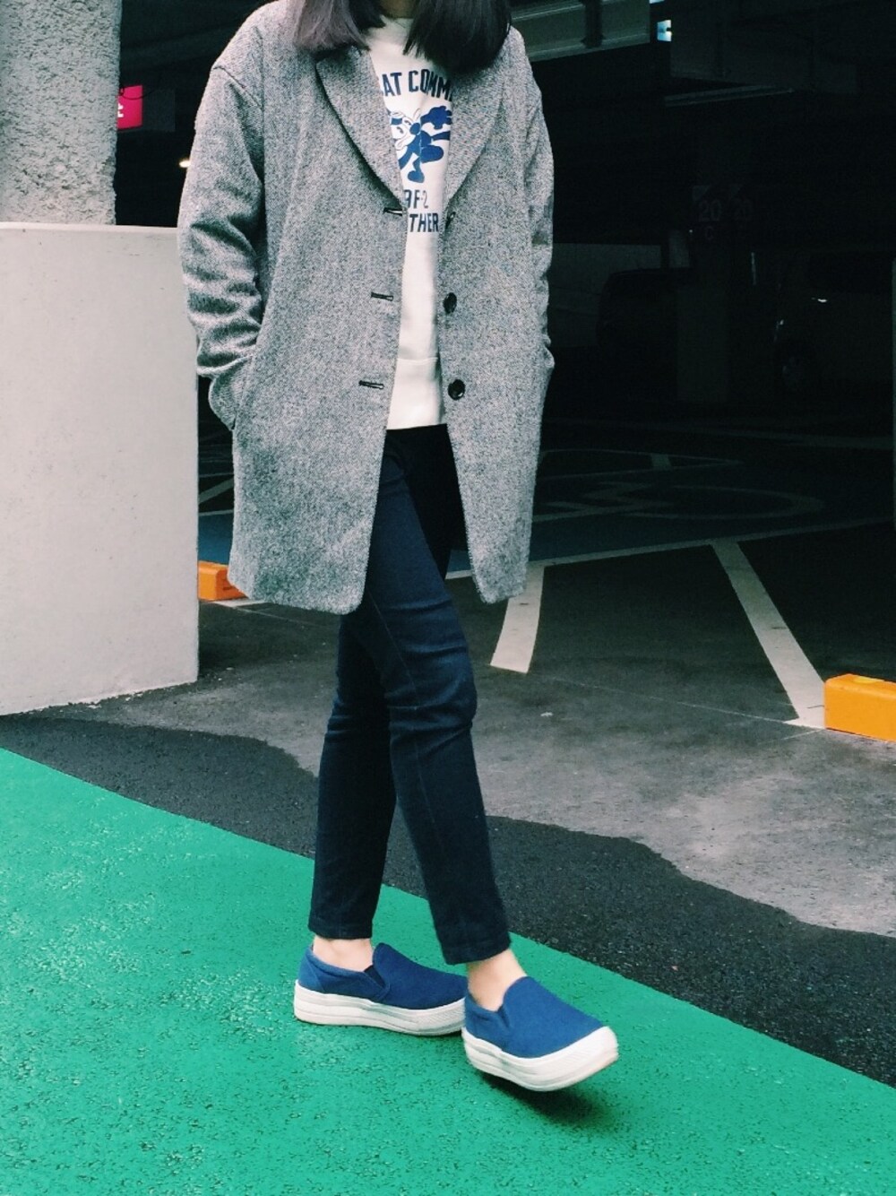 Coat : GU スウェット : 古着 Pants : UNIQLO スリッポン : right on