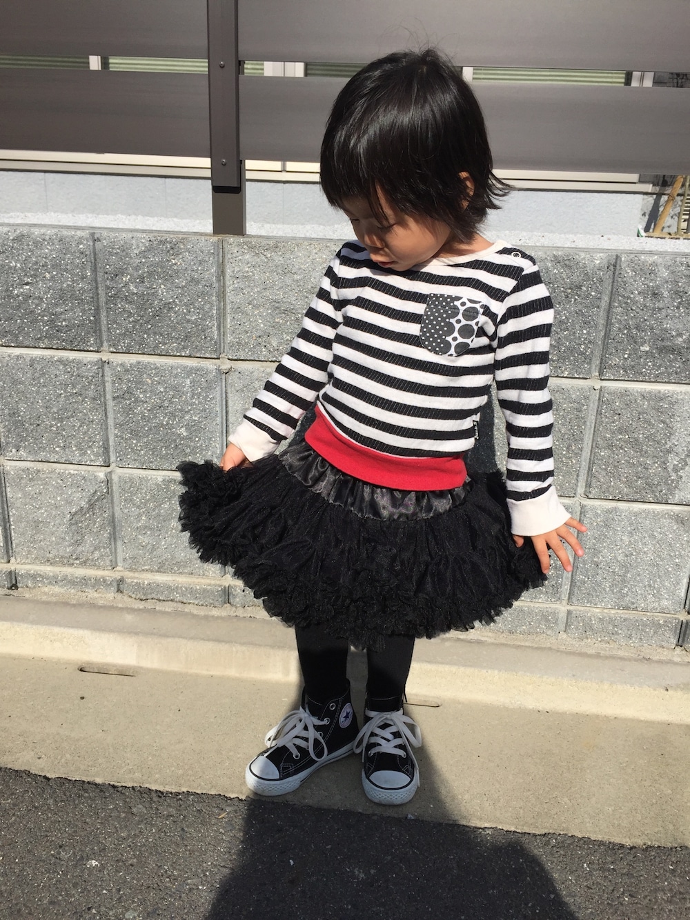 ボリュームスカートにコンバース。アウターはモッズコートで甘辛です。 今日はウチにお友達を呼んで、クリパしました。 スカートかわいいと言われて、嬉しそうななーちゃんでした。