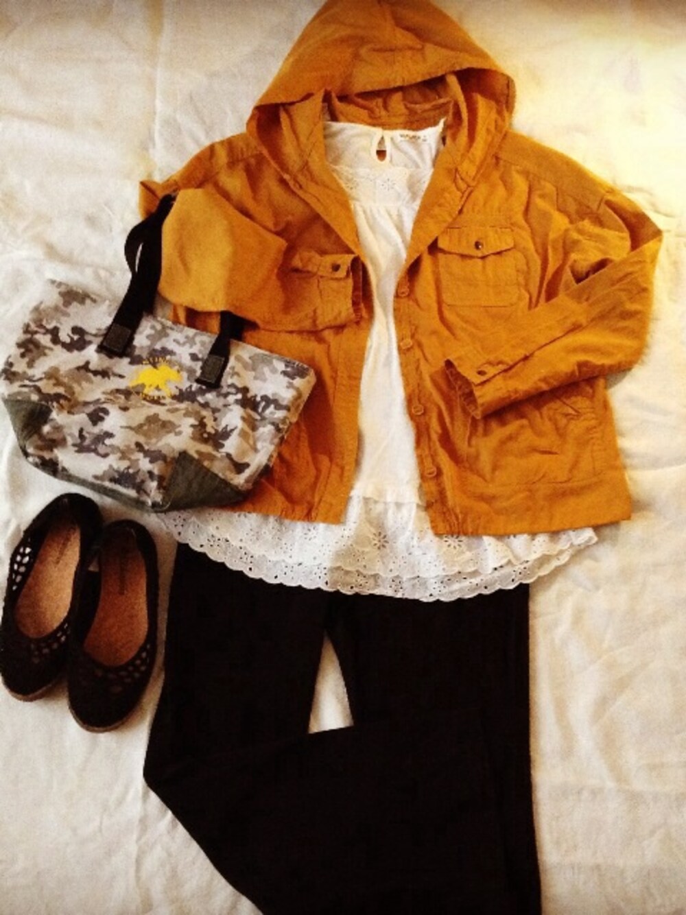 イエロー系のマウンテンパーカーを着用したレディースの春コーディネートの1枚目の写真