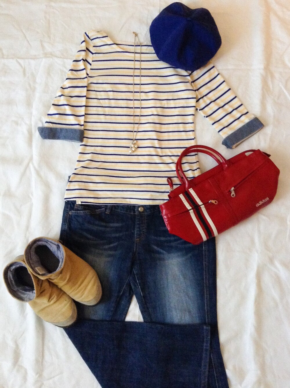 ●Tシャツが「青×黄のストライプ」なので、程良いアクセントが気に入ってます。 ●adidasの赤いバッグは、リサイクルショップでGET(⁎❛ั꒶̮❛ั⁎)ೄ。