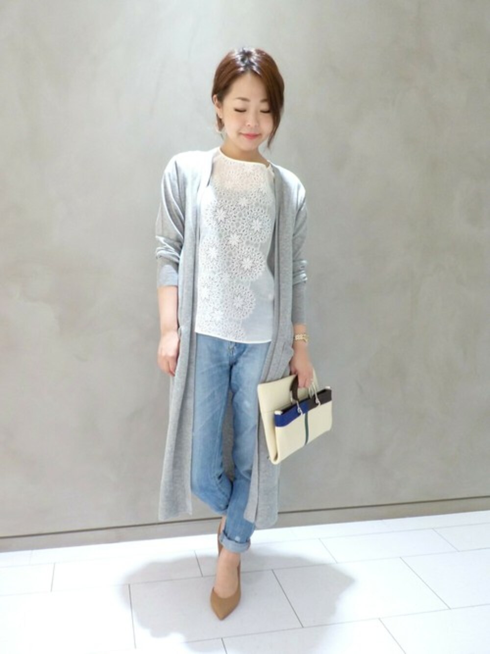 今の時季に重く見えがちなロングカーデを 透け感のあるブラウスと薄色なデニムで爽やかにコーディネート しました(*^^*) 見ため以上に涼しく軽いですよ~♪