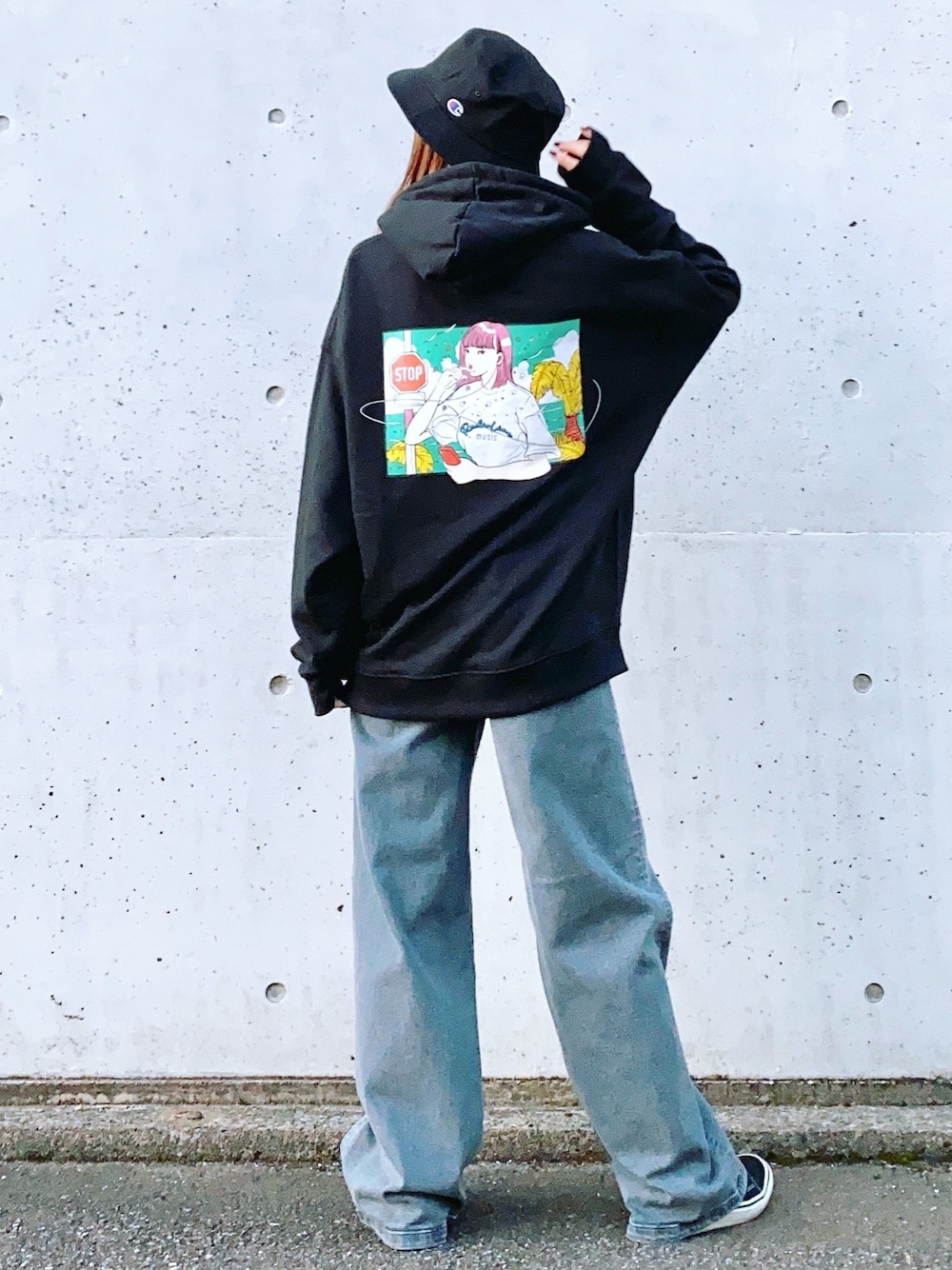 ストリートコーデ⭐︎ 個性的なプリントがポイントのパーカーです♪ 155㎝でmen'sのLサイズを着用しています(^^) somethingのワイドパンツは程よい股上の深さで、履き心地もバッチリです♪