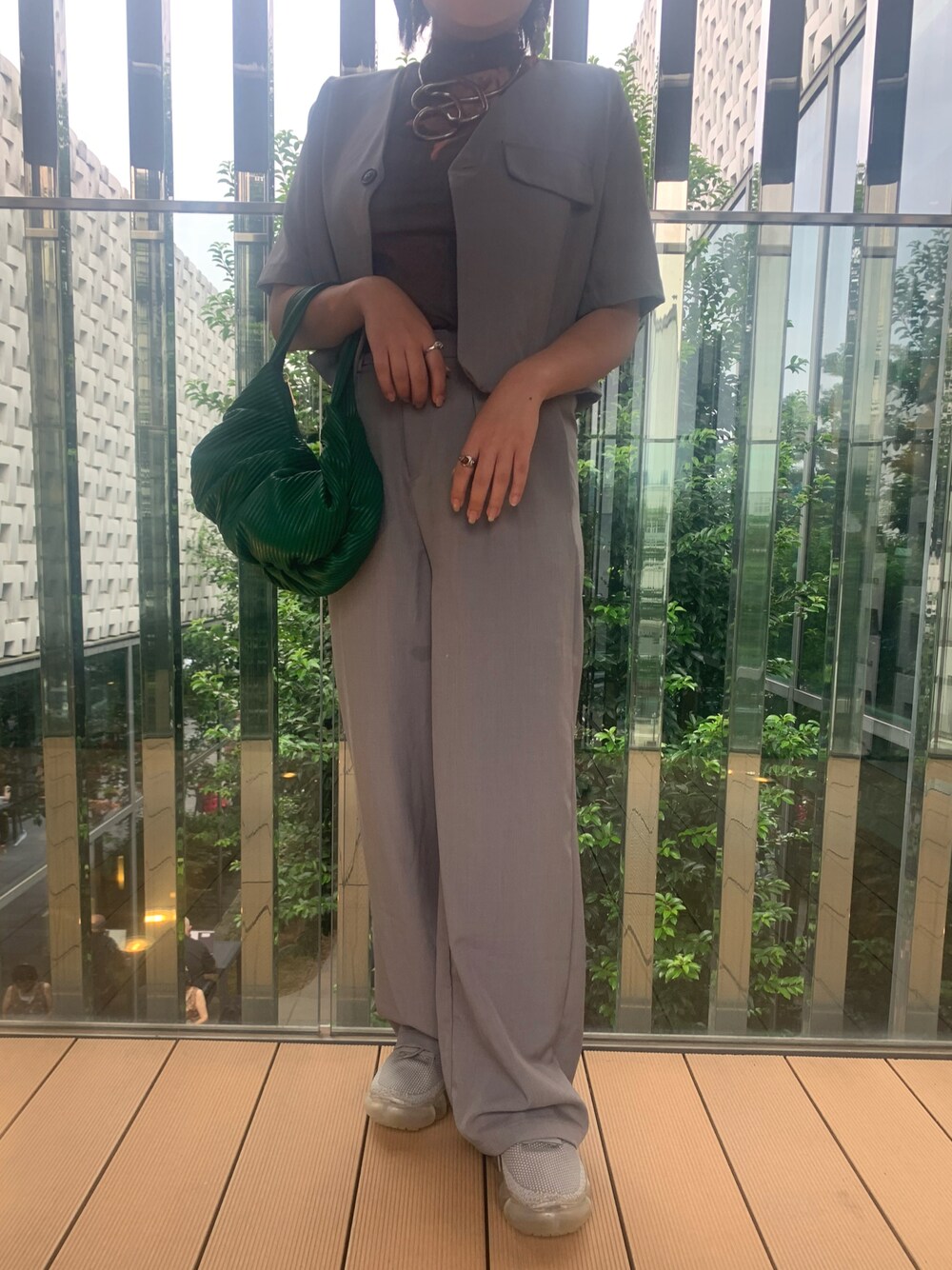 グリーン系のバッグを着用したレディースの夏コーディネートの1枚目の写真