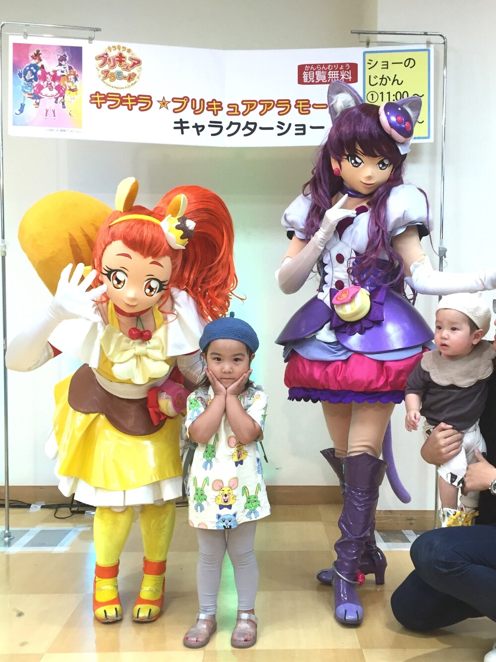 プリキュアショーにいきまして。 娘はマカロンとホイップ推し。 先日行ったフリマでゲットしたミニのTシャツがかわいすぎる件。 娘もお気に入り。