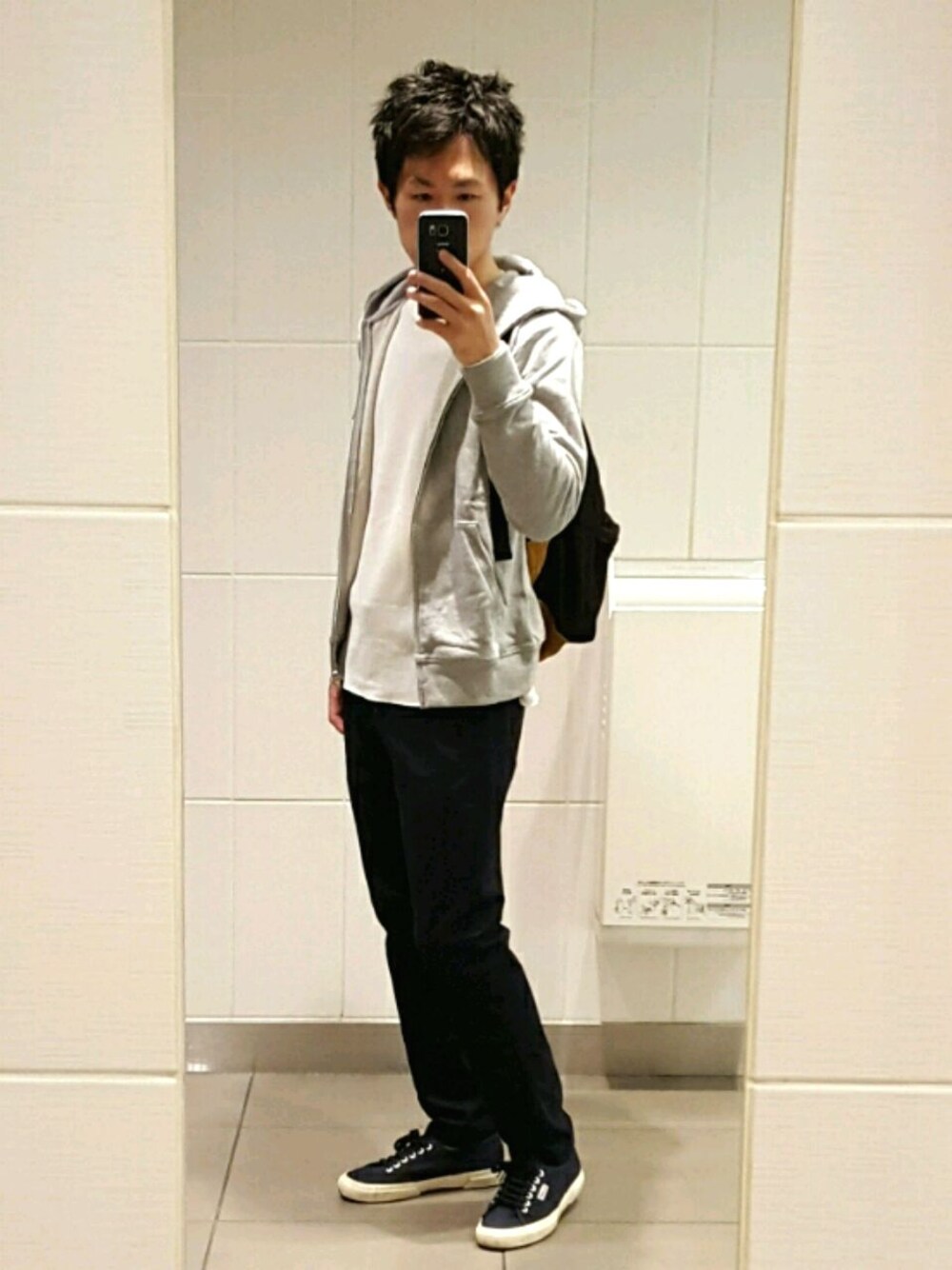 グレーパーカー、白サーマル、ネイビーチノパン、スニーカー=超普通! だが、それがいい!(と思い込む!)