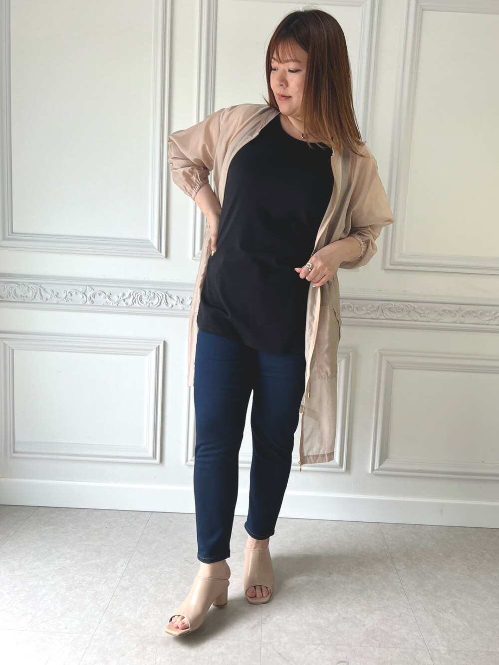 Iラインですっきり感もありながら シアー素材の羽織りで涼し気に♡