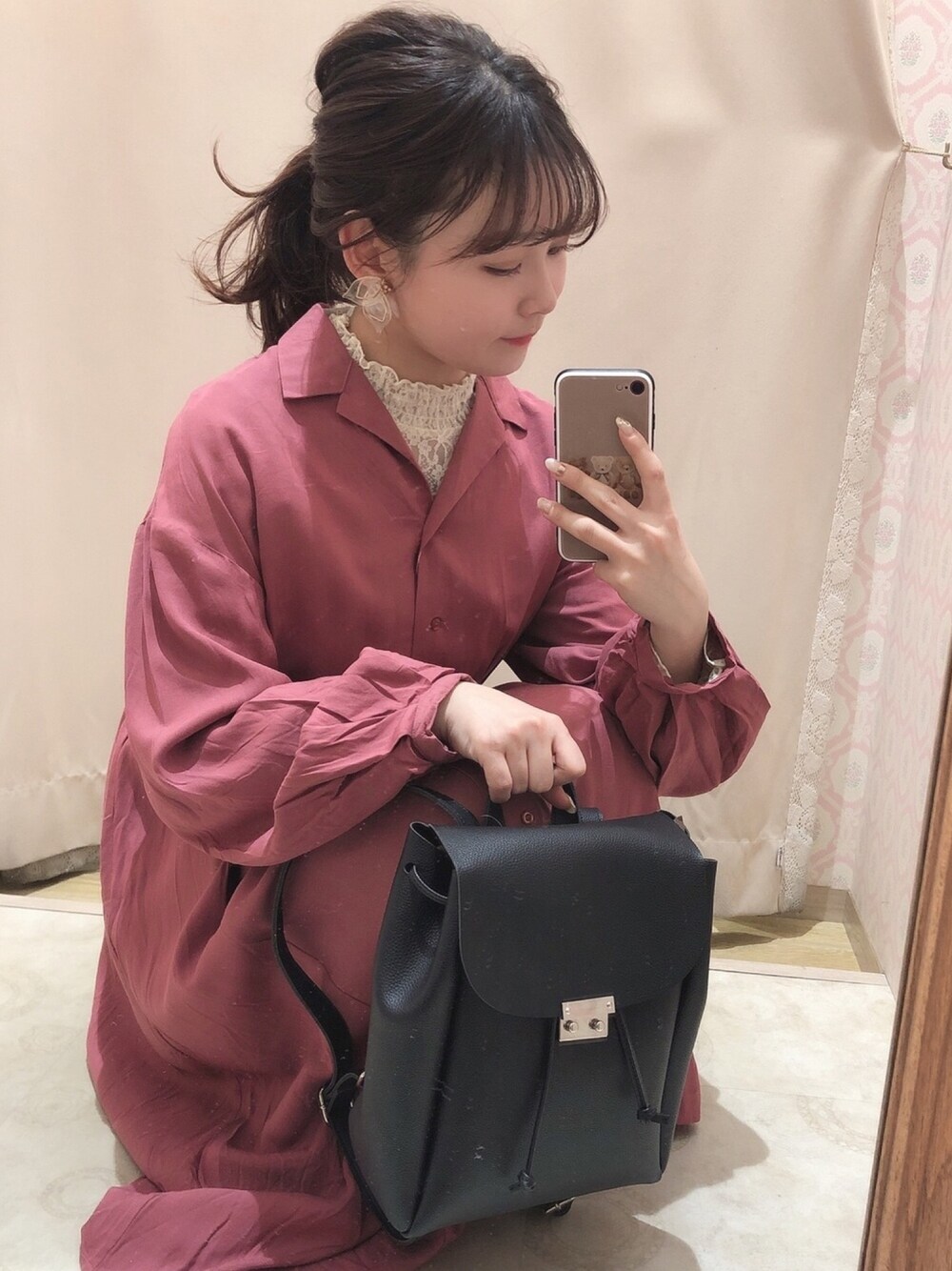 𓆝𓆟𓆜𓆞𓆡 お久しぶりです🌷 目を引くピンクに一目惚れ🥺💗 色味がめちゃくちゃ可愛いワンピです! ウエストマークもあるのですが、少し緩かったのでベルトで更に引き締めました🎶 小物は黒で締めて、胸元はレースで華やかに🎀 相変わらず開襟やVネックにはハイネックを重ねがち😌