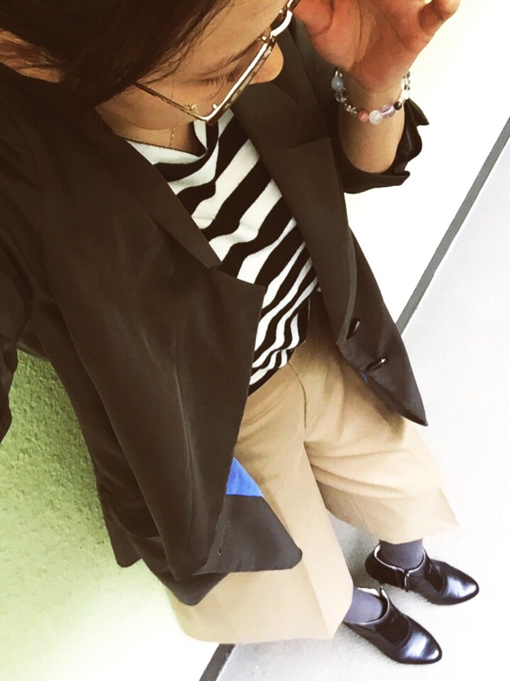 珍しくジャケットスタイル! このジャケットは年代物だけど、袖がゴム入りでくしゅくしゅしてて、着丈も長く、裏地がキレイなブルーでヒネリが効いててお気に入り☆