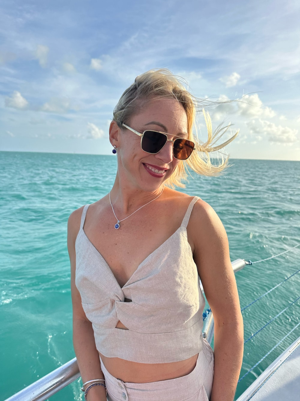 Classic linen set from Italian atelier paired with gold rimmed aviators for sunset cruise
