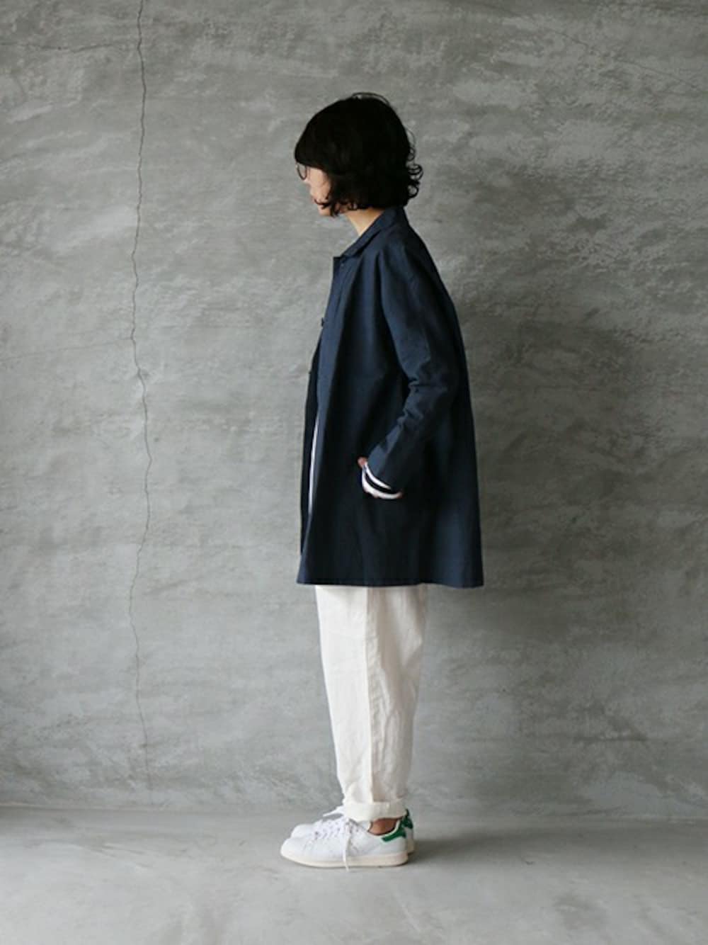 ショート丈のコートに 白デニムと白スニーカーを合わせました。 *items* メガネ : NEWMAN コート : Veritecoeur デニム : YARRA スニーカー : adidas originals