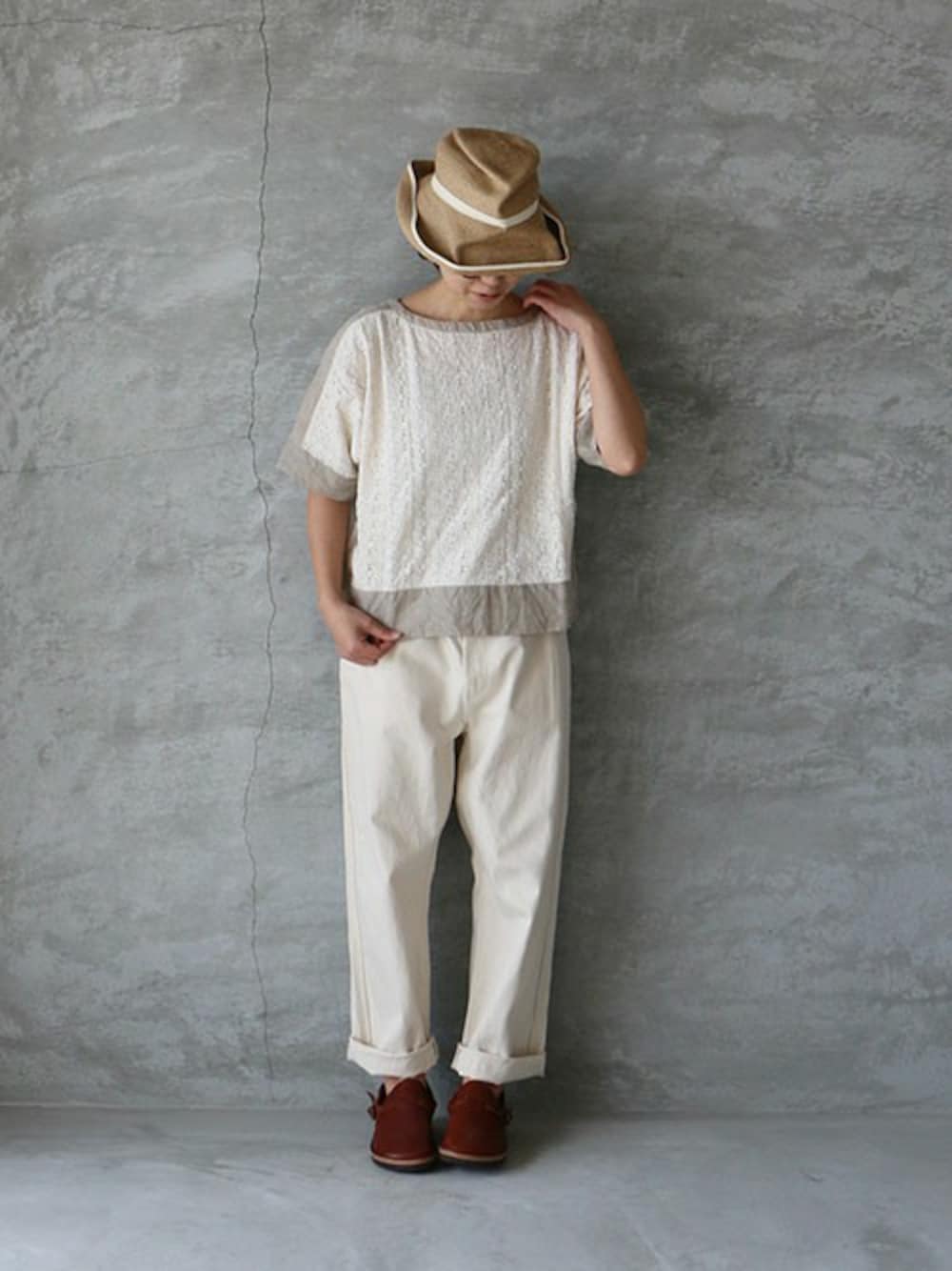 レースのブラウスのホワイトデニム 足元はストラップシューズです。 *items* 帽子 : mature ha. メガネ : NEWMAN ブラウス : soi-e パンツ : soi-e 靴 : fracap