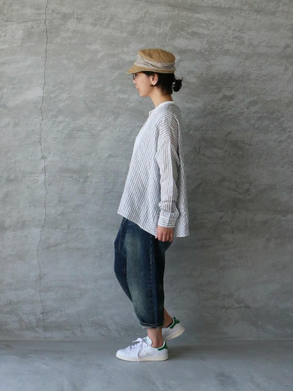 ストライプのコットンブラウスに デニムのサルエルパンツを合わせました。 *items* 帽子 : mature ha. メガネ : NEWMAN ブラウス : nicholson and nicholson デニム : ichi スニーカー : adidas
