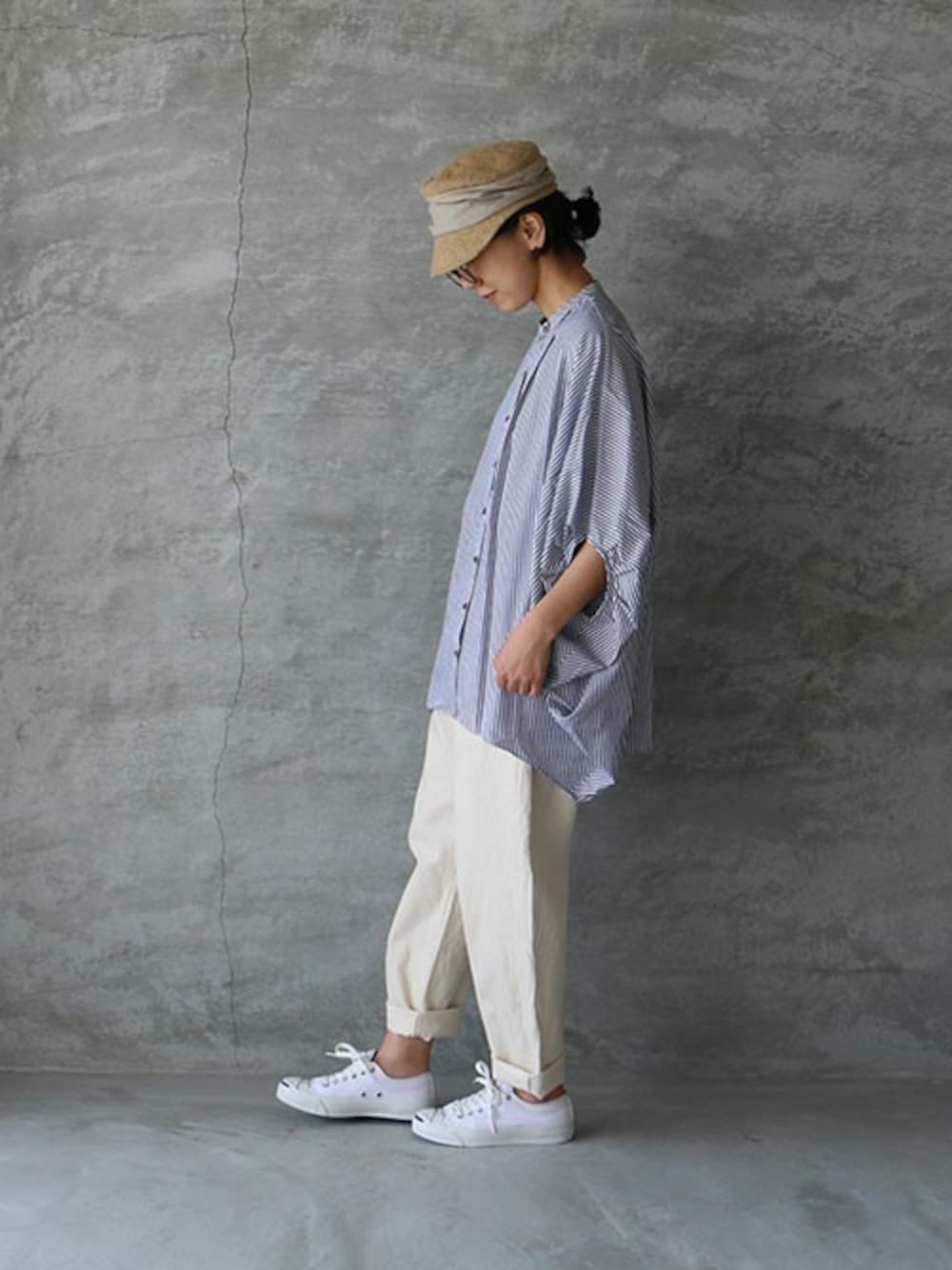 ストライプのワイドシャツに 白デニムを合わせました。 *items* 帽子 : mature ha. メガネ : NEWMAN シャツ : mizuiro ind デニム : soi-e スニーカー : converse