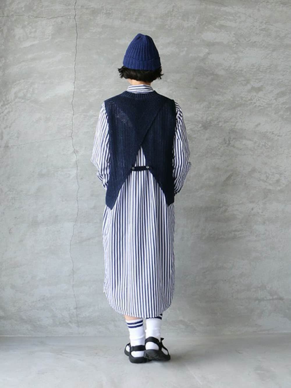 リネンのニットベストに ストライプワンピースとサンダルを合わせました。 *items* ニット帽 : frenchbull ベスト : doux bleu サンダル : teva