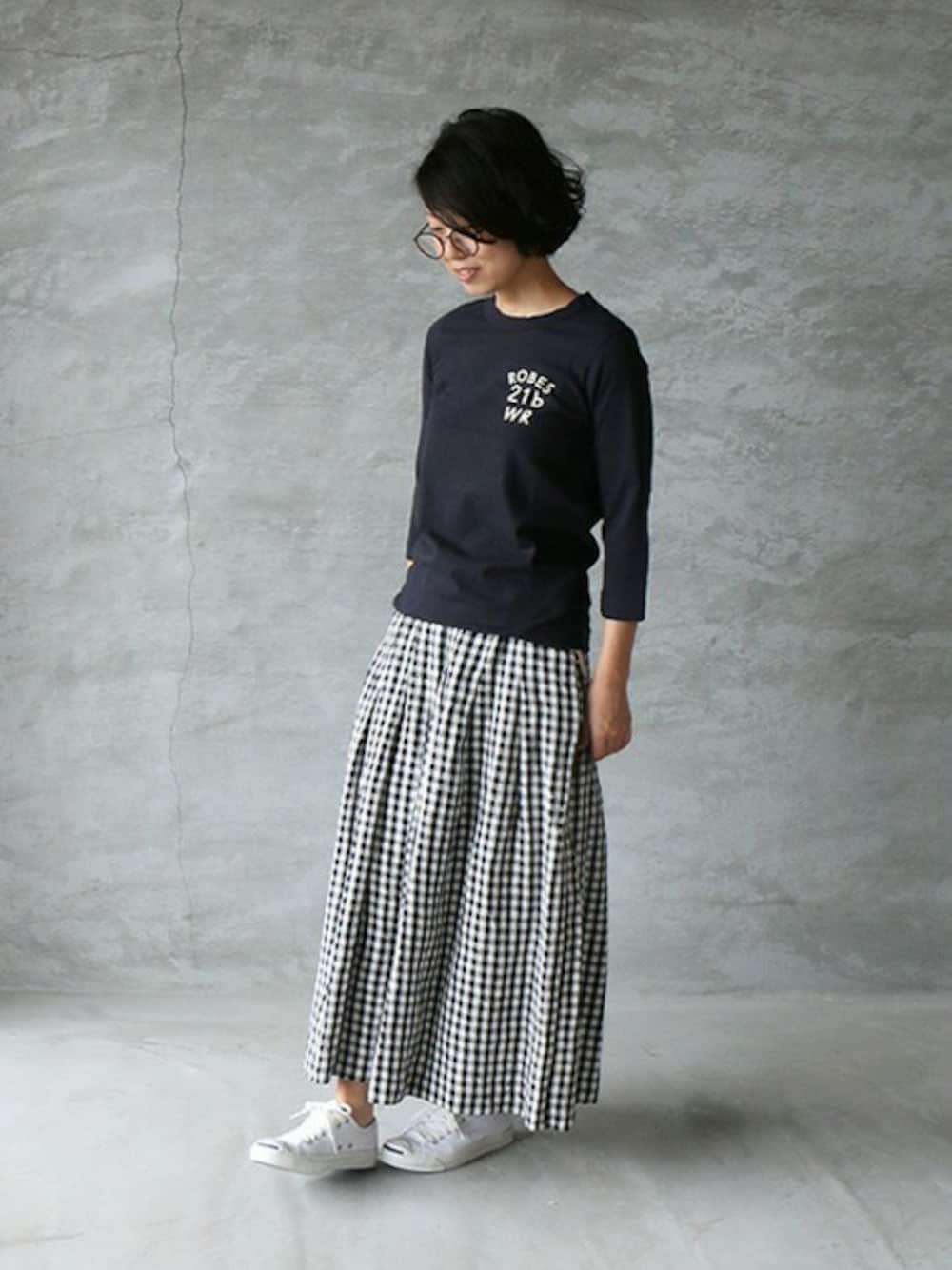 ロゴTシャツにギンガムチェックの ロングスカートとスニーカーを合わせました。 *items* Tシャツ : a piece of library スカート : ina スニーカー : converse