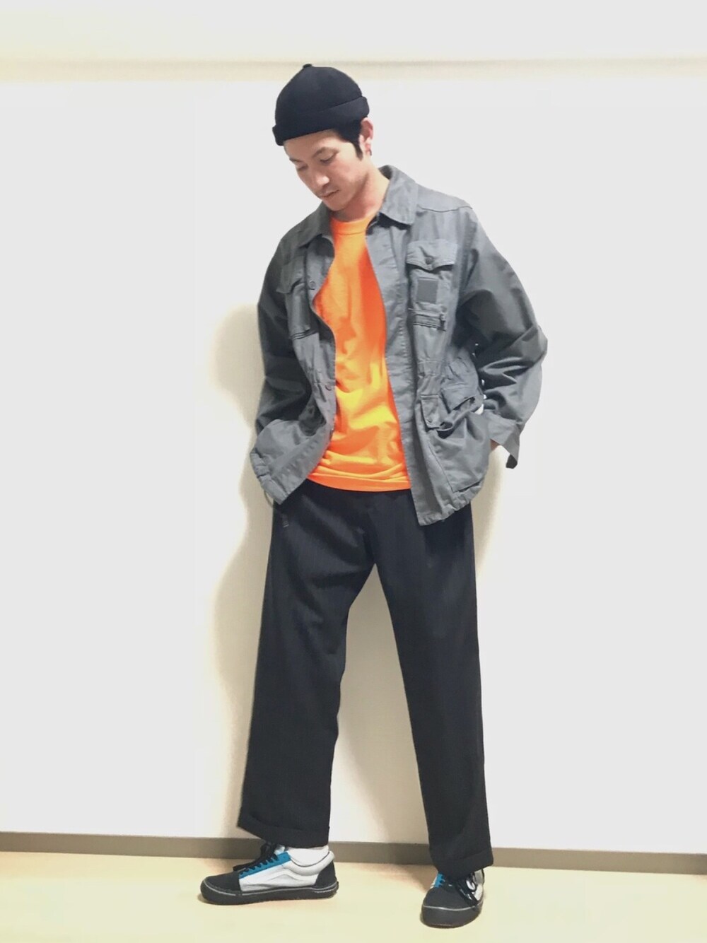 ミリタリージャケットに黒のワイドスラックスを合わせて見ました!! オールドスクールも色がマニアックで普通に可愛いです!! フォローよかったらしてくださいね〜😜