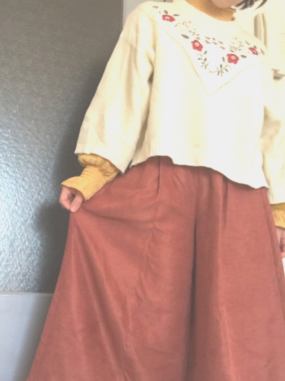 ©︎ h i .のニット/セーター「w closet ・W 花刺繍ガーター編みニットプルオーバー」を使ったコーディネート