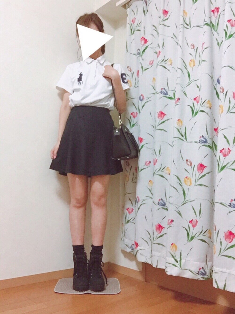 インカメで撮ってるのでポロシャツの数字とロゴが反転してます😭 ポロシャツお気に入りです👕✨ skirt:UNIQLO shoes:H&M