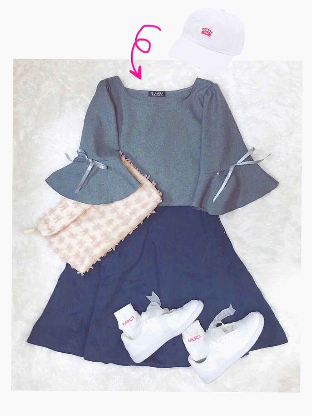 ダークトーンな気分だけど 春よこいこいなので スニーカーとキャップで大好きなホワイトを+ 靴下のロゴとバッグはピンクでかわいいです🎀