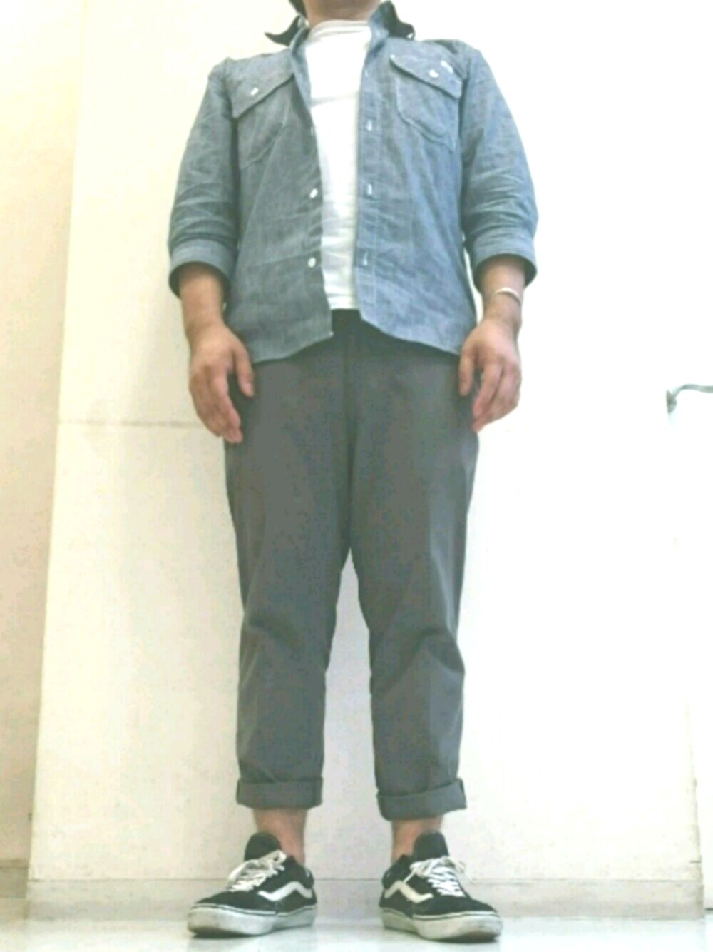 今日のシャツはLeeのシャンブレーシャツ。 これも店舗販売はしていないモデルのものです。 個人的に今七分袖のシャツがお気に入り(笑) 半袖でも長袖でもないこの中途半端な感じが好き♪ スニーカーはVANSのオールドスクール。 このスニーカー、何でも合うよね(笑)