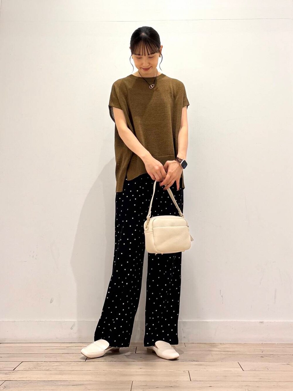 リネンレーヨンドットイージーパンツです! 毎年人気のドット柄イージーパンツ、今年はレーヨンがミックスされました◎ 落ち感がプラスされセミワイドのシルエットが綺麗です^ ^