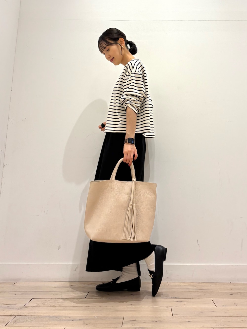 すっきりとした丈感が今年のトレンドですよね◎ FORK&SPOONのこちらのトップスは着丈は短めで肩の落ちたデザインが女性らしい印象に^ ^ タイトスカートはストレッチも効いており、歩きやすいです👏
