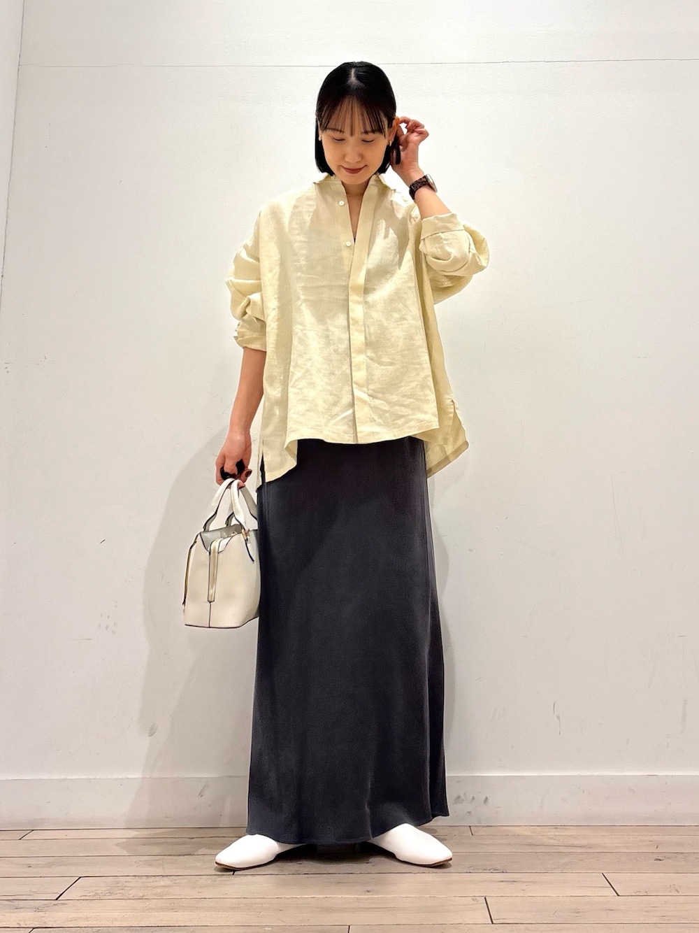 かぐれのリネンシャツで柔らかな色合いのイエローに一目惚れです♡ 一気に春らしいコーディネートに^ ^
