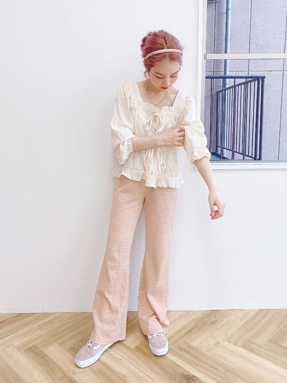 5/2 チェックパンツにバンズ可愛い!