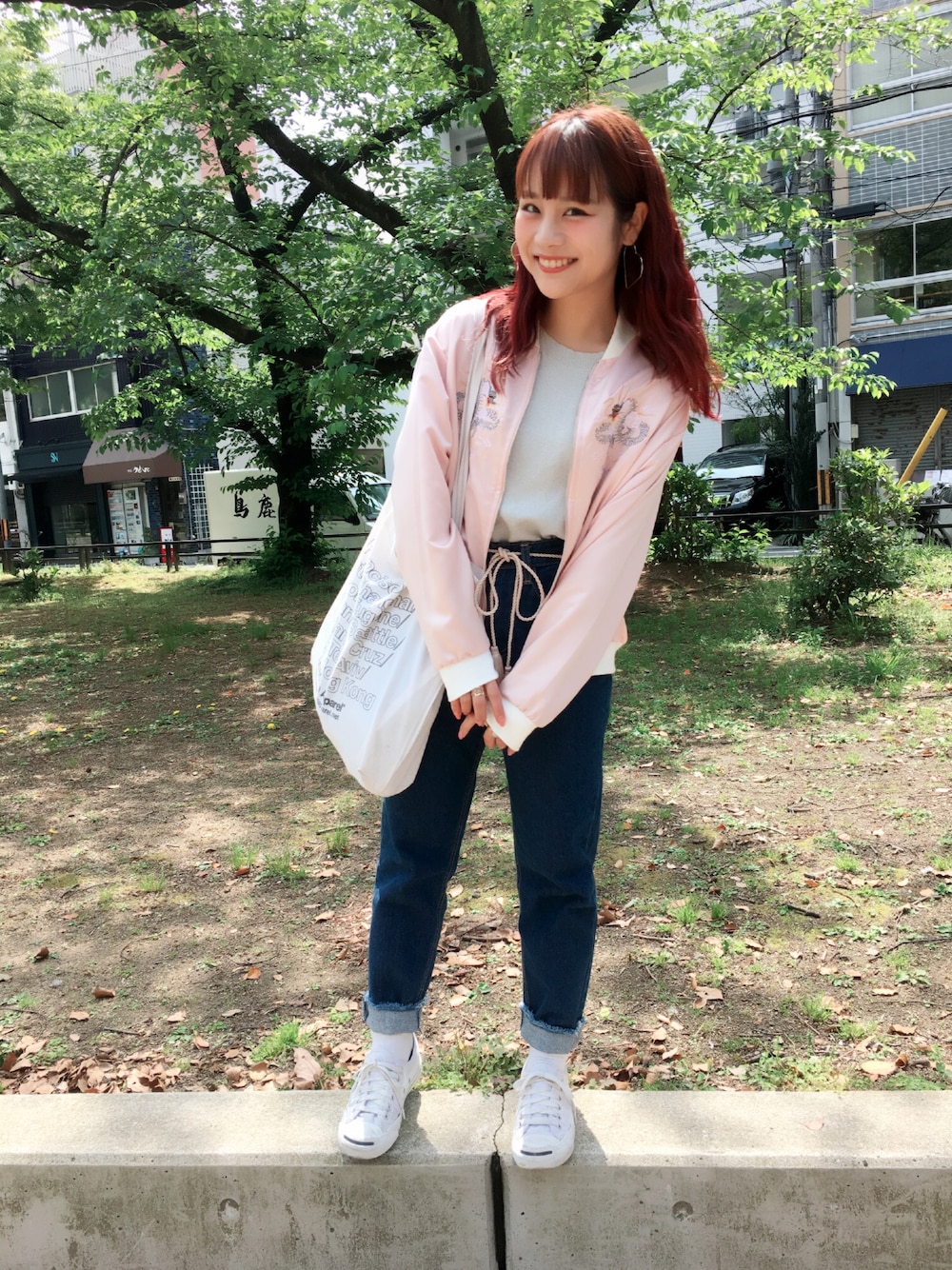 4/25 ピンクのスカジャンコーディネート♡ 帯紐ベルトがアクセントになって 可愛いですー😋 ameriのパンツは形がジャスト👆🏻