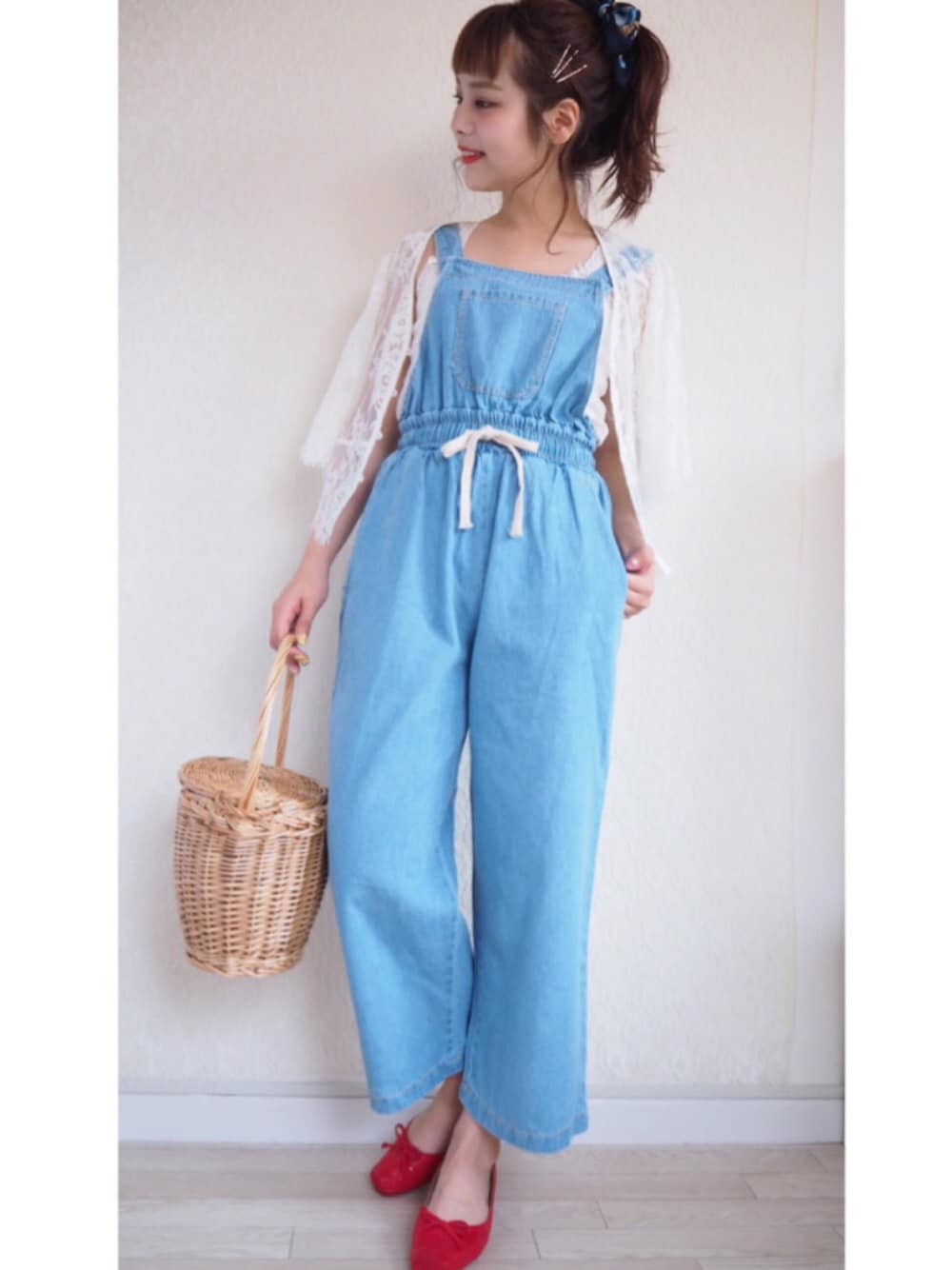 jumelle コーディネート 🌻🌻🌻 夏っぽいブルーのオールインワンに さし色で赤のシューズを👠👠👠 それにカゴバッグでとことん夏!!!! こんな感じでピクニックとかしたい。。。