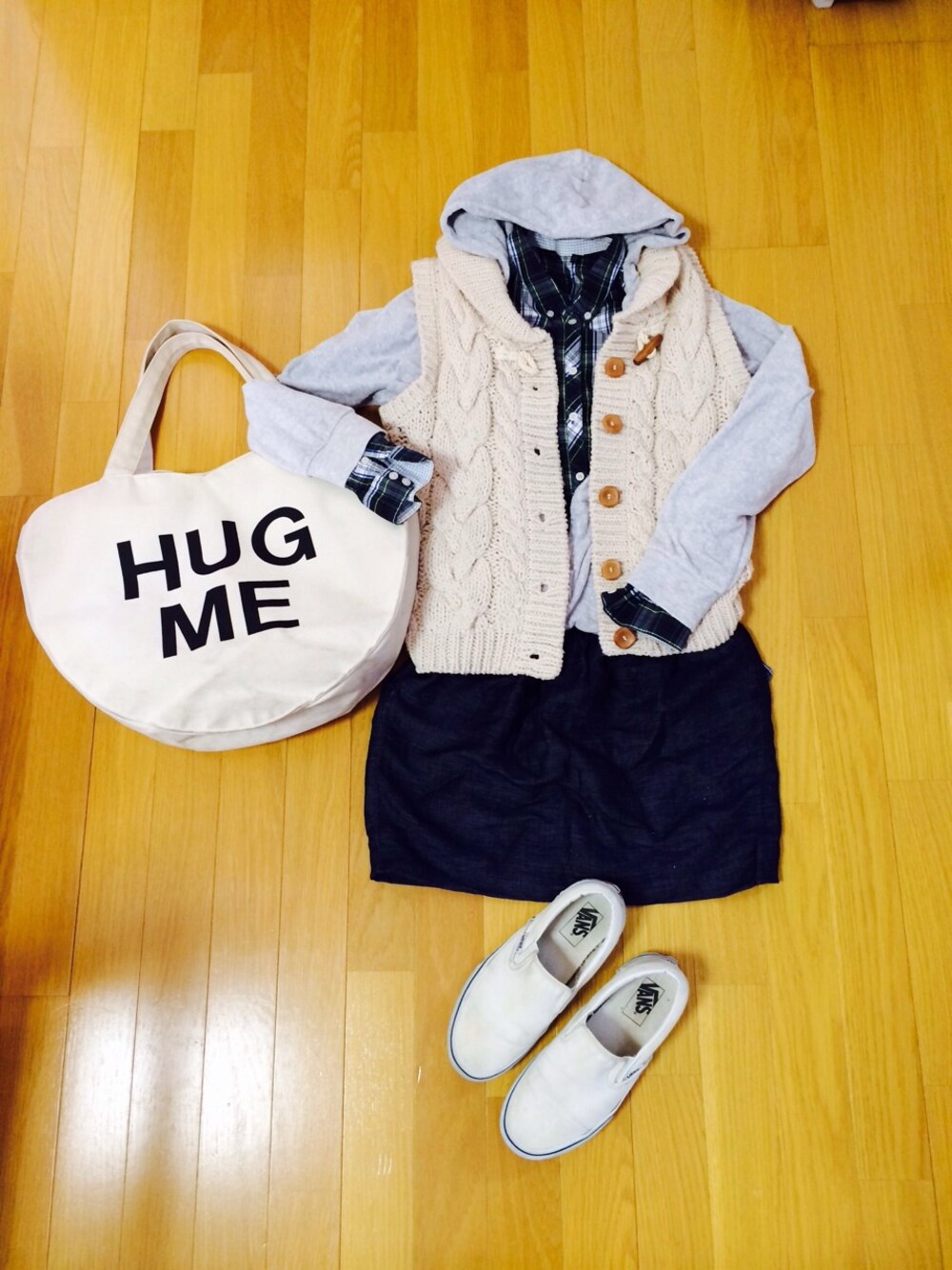 重ね着重ね着重ね着♡ ベスト♡ライトオン チェックシャツ♡ザラ デニムスカート♡ザラ パーカー♡UNIQLO 靴♡VANs