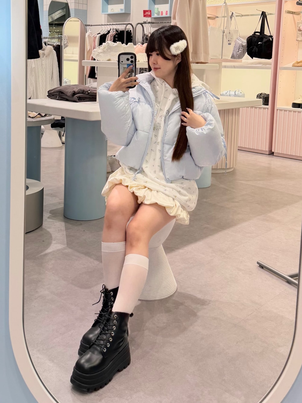 ami(OLIVE des OLIVE HEP FIVE)のダウンジャケット/コート「リボンエコダウンブルゾン」を使ったコーディネート
