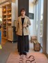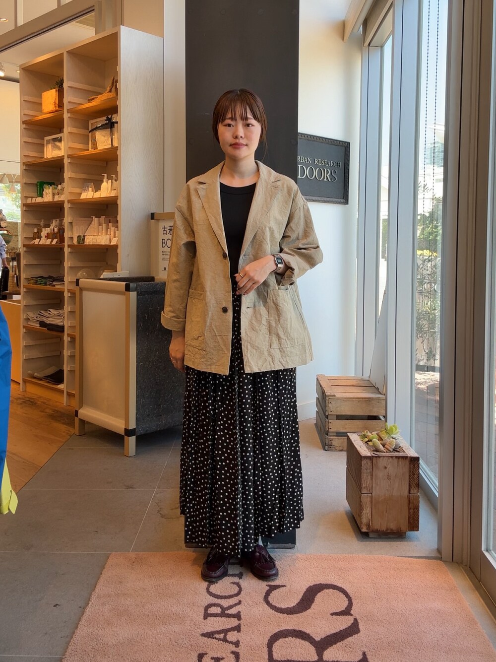 かぐれのテーラードジャケットは張りがしっかりあるのですが、重量感も少なく秋口から気軽に羽織れるアイテムとなっております! また、ドットのスカートで柔らかい印象を出してみました😊