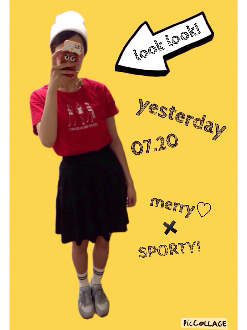 Tシャツ/merry jenny スカート/GALSTAR 靴下/靴下屋 スニーカー/オニツカタイガー ニット帽/不明 昨日のコーデ! スポーティーに着てみました☻ こんな丈のスカート履くの久々