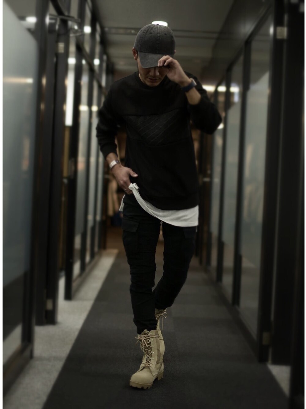 ベージュ系のブーツを着用したメンズの冬コーディネートの1枚目の写真