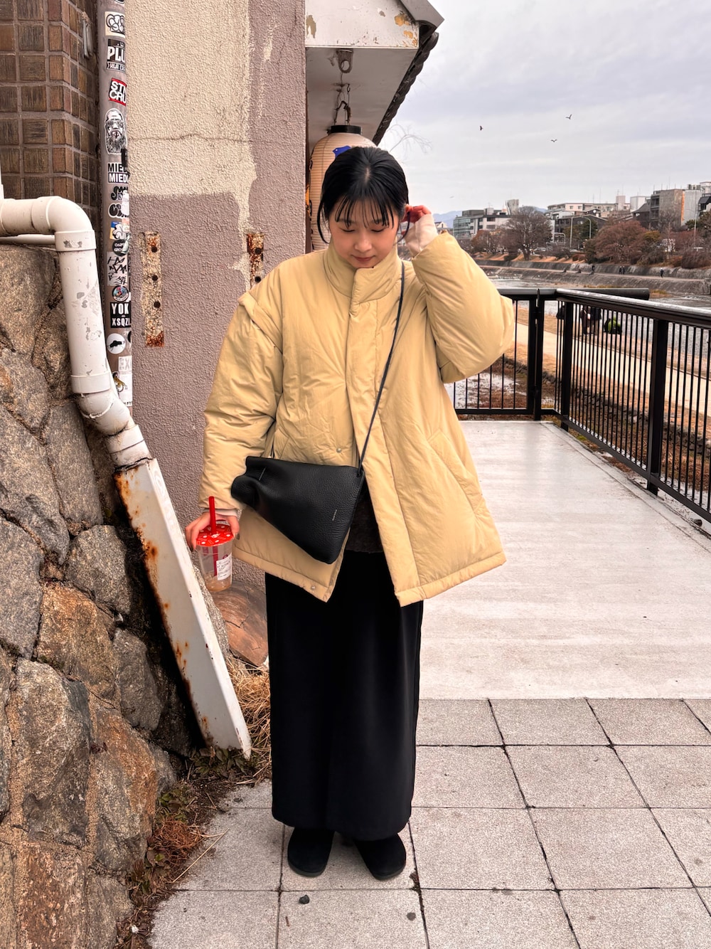 今日はプレゼントしてもらったバッグが主役のコーデ✨ かわいいー! 初めて鴨川降りました ギター演奏中の👨🏻🦳がいたり、泳ぎ方がおかしい🦆がいたり。ゆるやか休日 ロングブーツでかアウターコーデしたい 間に合うのか。。。