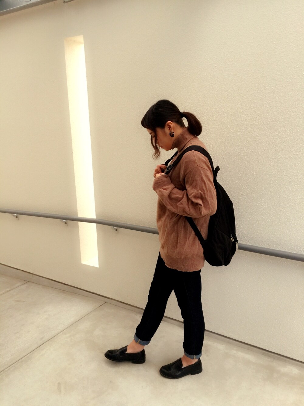 ブラウン系のトップス、ブラック系のデニムパンツを着用したレディースの秋コーディネートの1枚目の写真