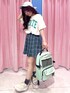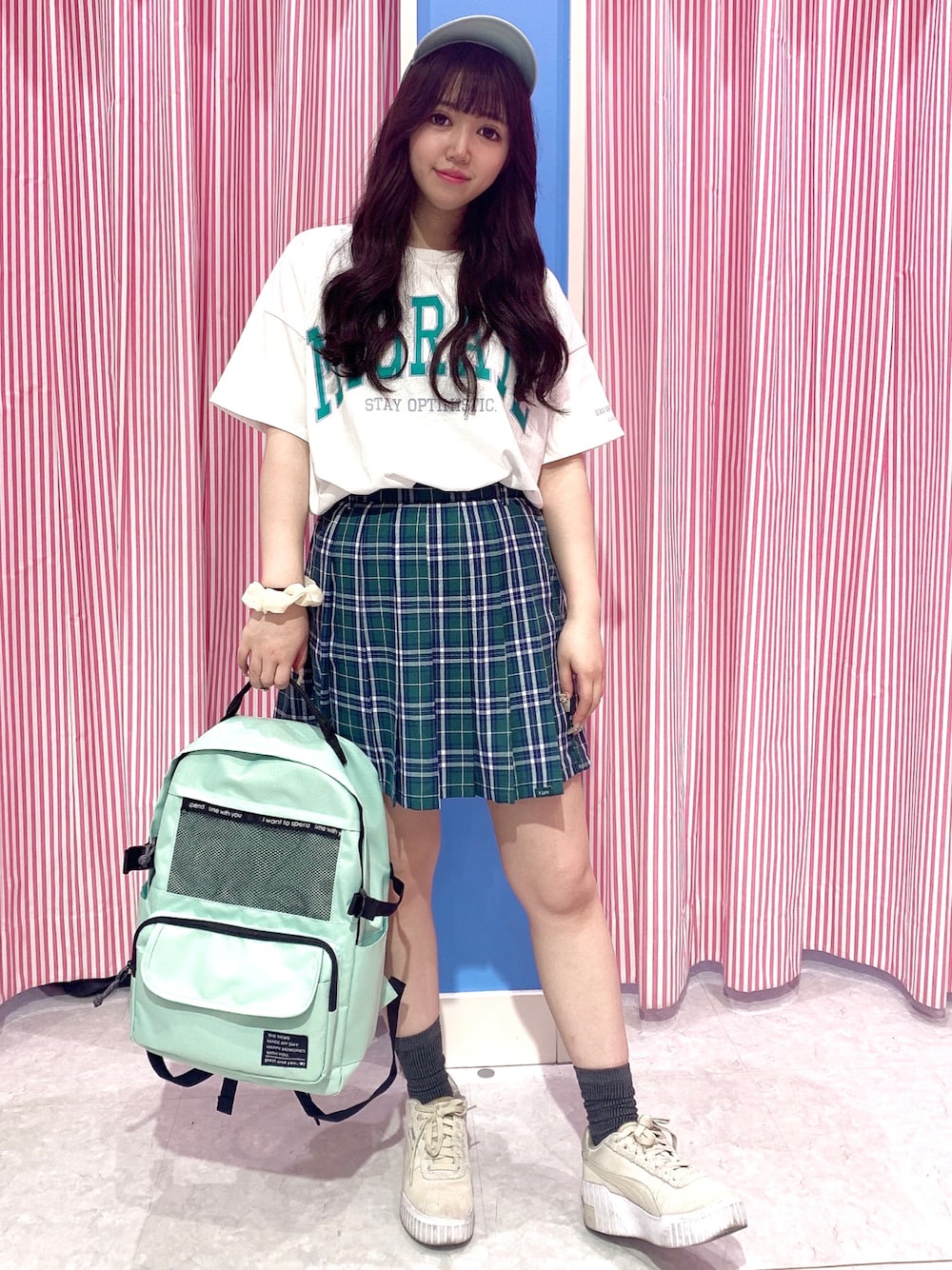 BIGシャツワンピ着回しコーデ① ワンピにもトップスにも使える ゆるっとしたオーバーサイズだよ! カレッジロゴが特徴的な主役間違いなしのアイテム◎ カラー展開も豊富でコーデも楽しめちゃう♡ 今回はチェックスカートと合わせて韓国風に スタイリング!! ロゴの色に合わせてスカートも 小物もグリーンで統一してみたよー!