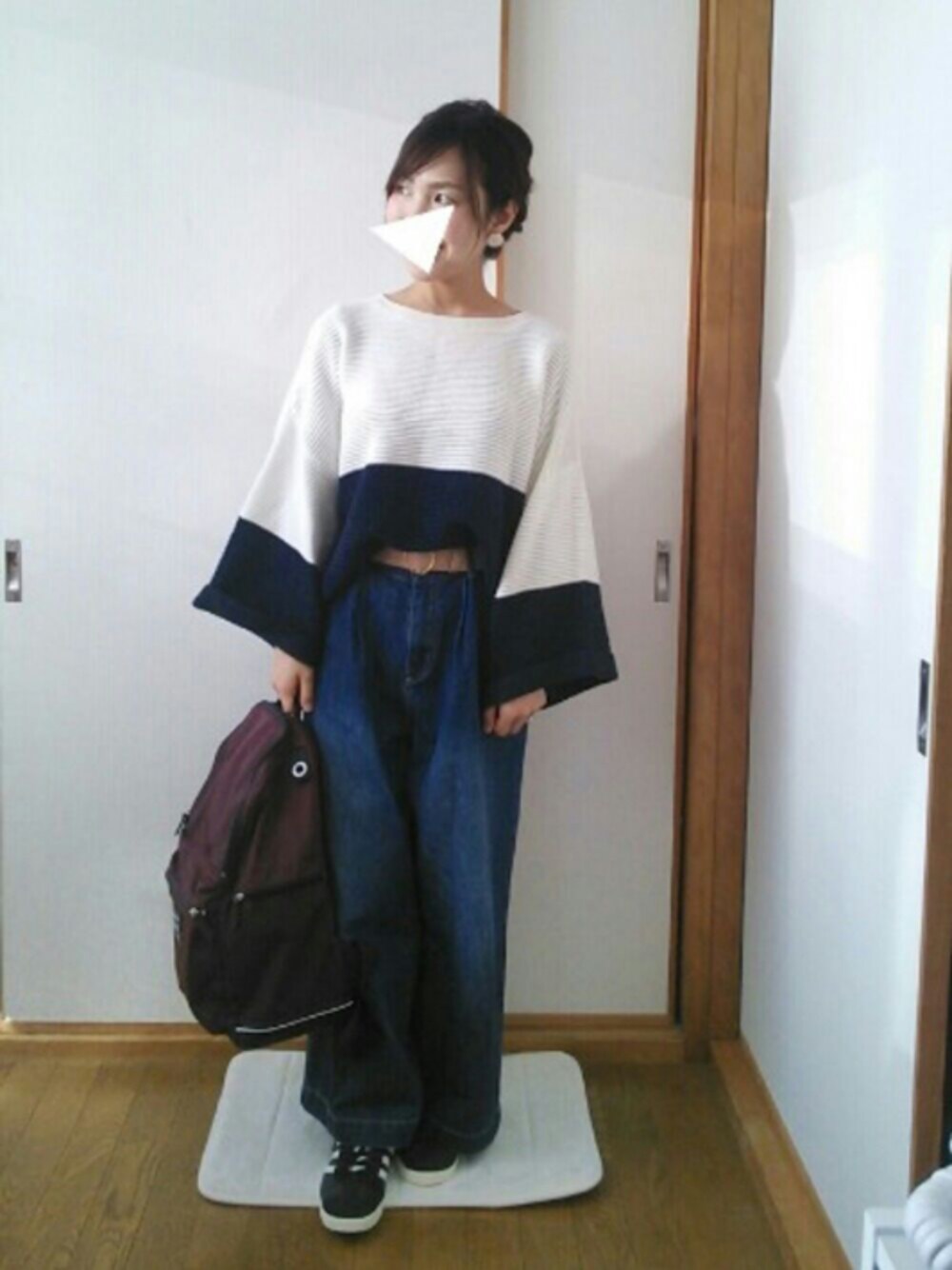 今日は動きやすく、カジュアルに♡ LOWRYS FARMのニット、 ワイドスリーブになっているので スカスカして寒くて着られなかったんだけど やっとちょうどいい感じの気候になってきました😄 そろそろ雪とけてきたし、 スニーカーで歩けるかなー?
