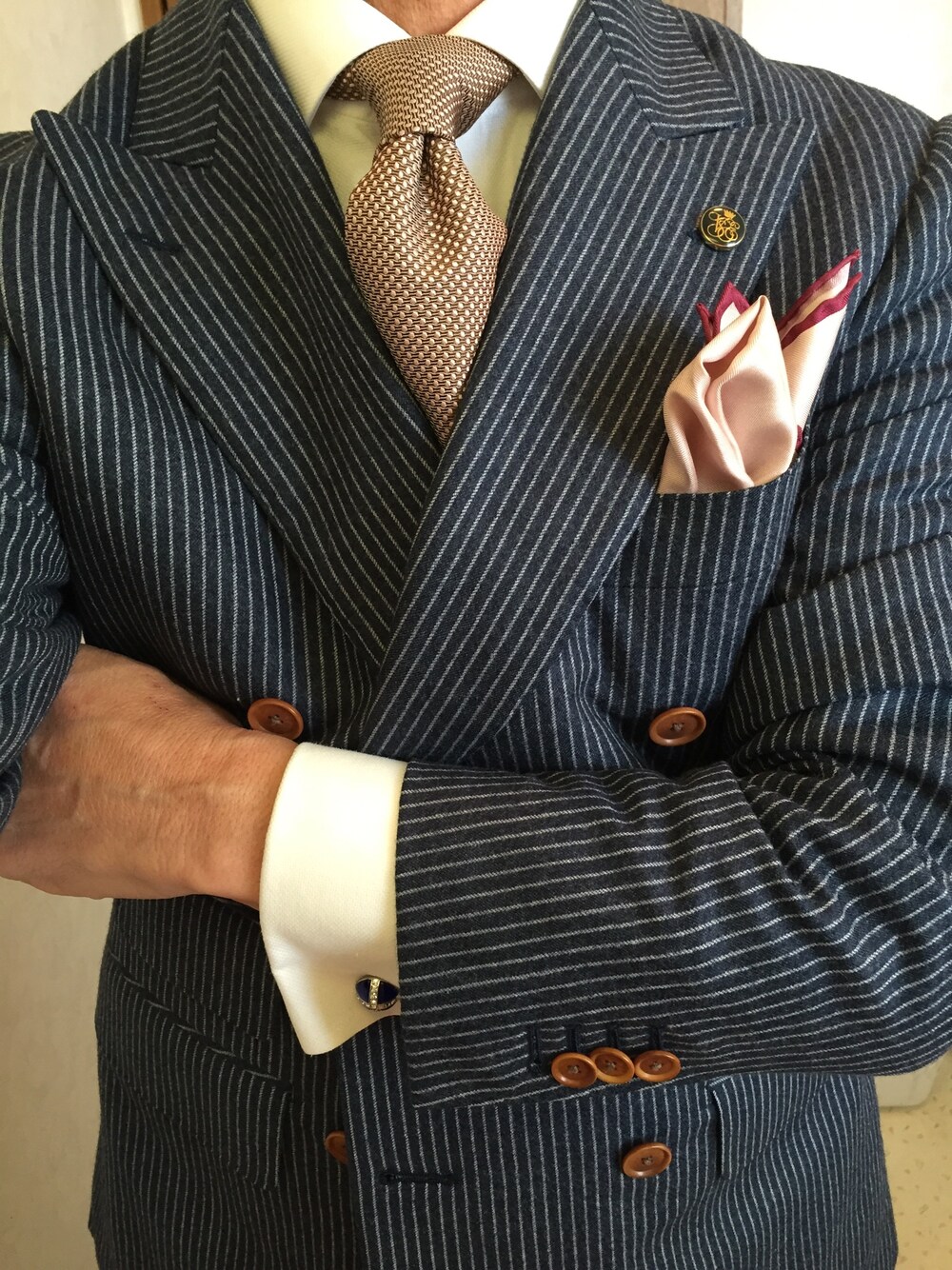 このネクタイは10年以上前のモノ。 剣先の幅は10センチ。 ダブルのスーツなら、その古臭さも目立たない。