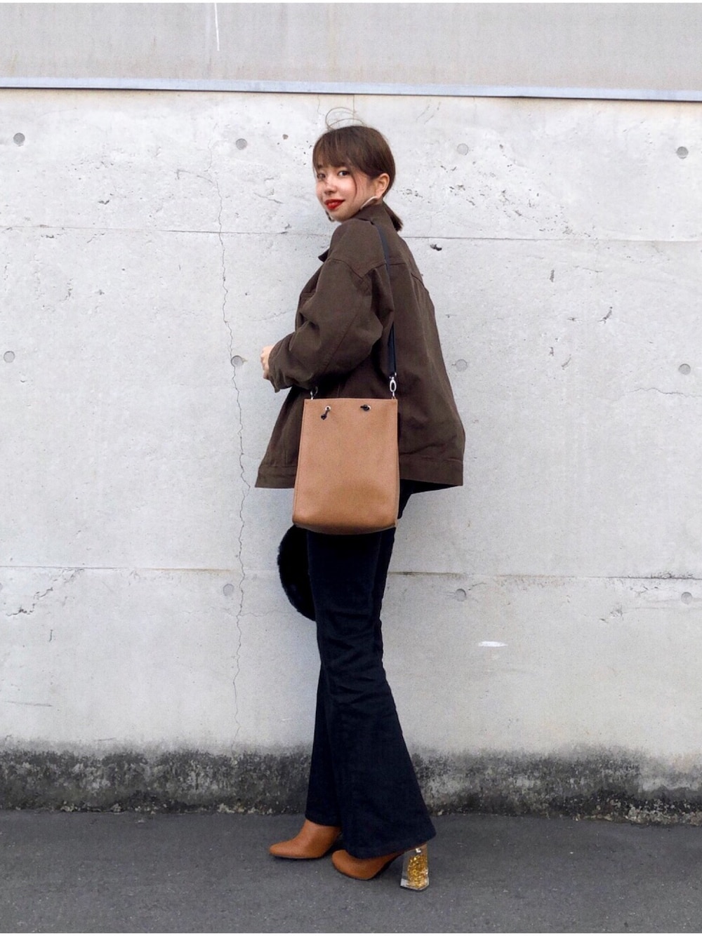 ブラウン系のデニムジャケット、ブラウン系のブーツ、ブラック系のパンツを着用したレディースの冬コーディネートの1枚目の写真
